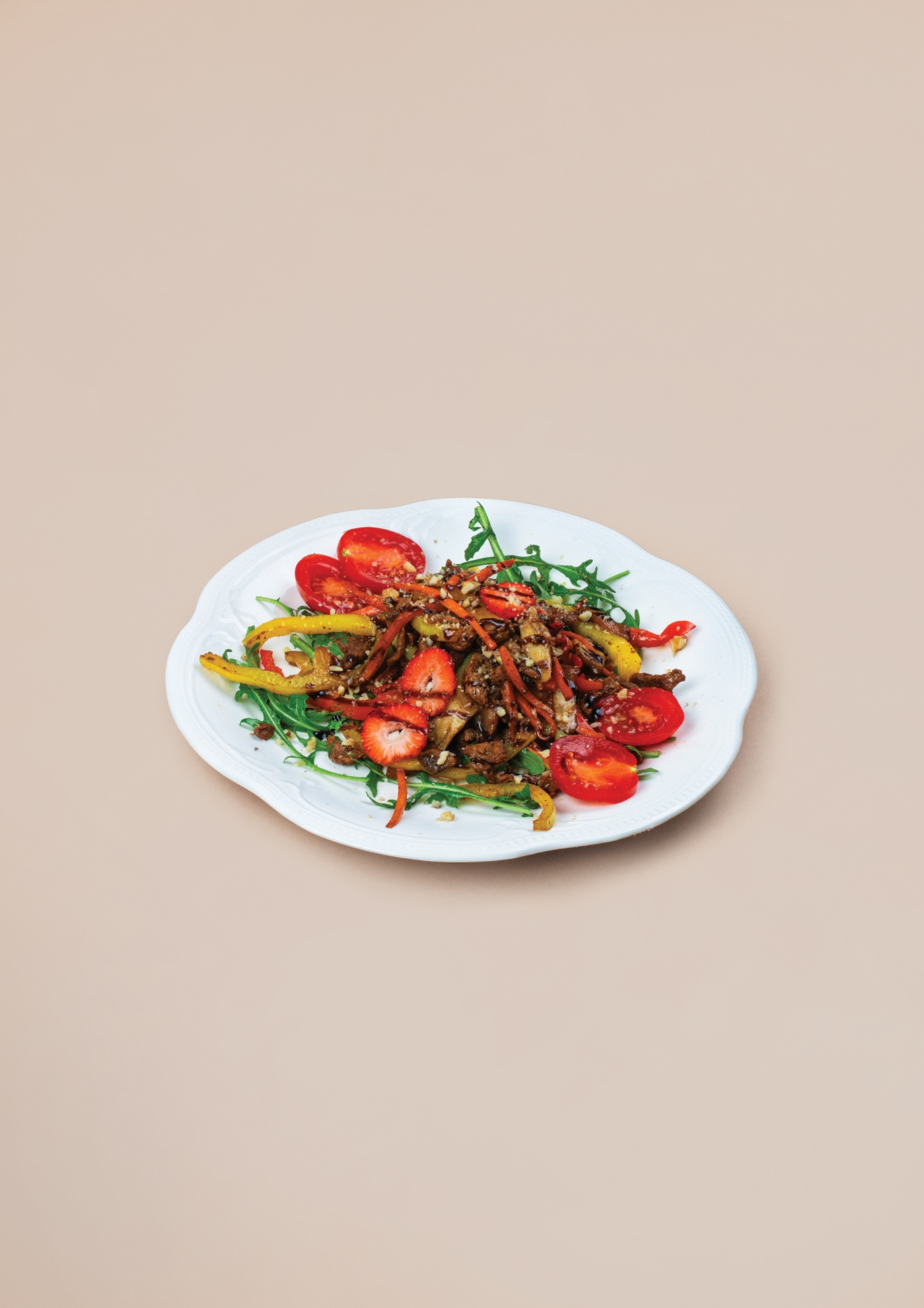 Beef tenderloin, bell pepper, carrot, strawberry, soy sauce, arugula