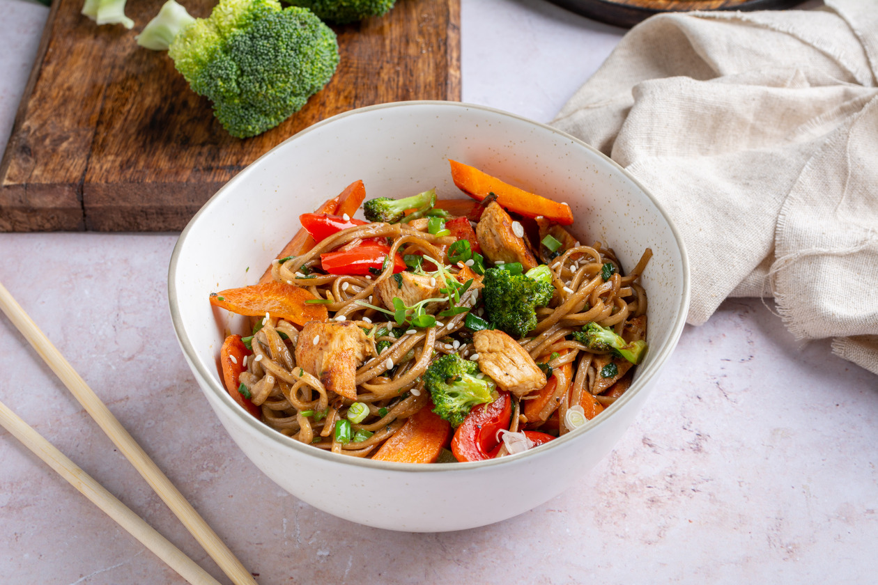 Buckwheat noodles, chicken fillet, bell pepper, carrot, broccoli, sauces, spices
