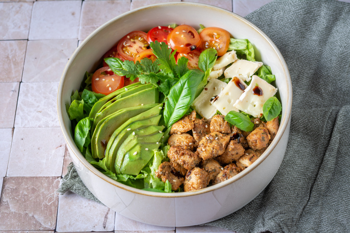 Chicken , mix salad, avocado, cherry tomatoes, brie cheese
