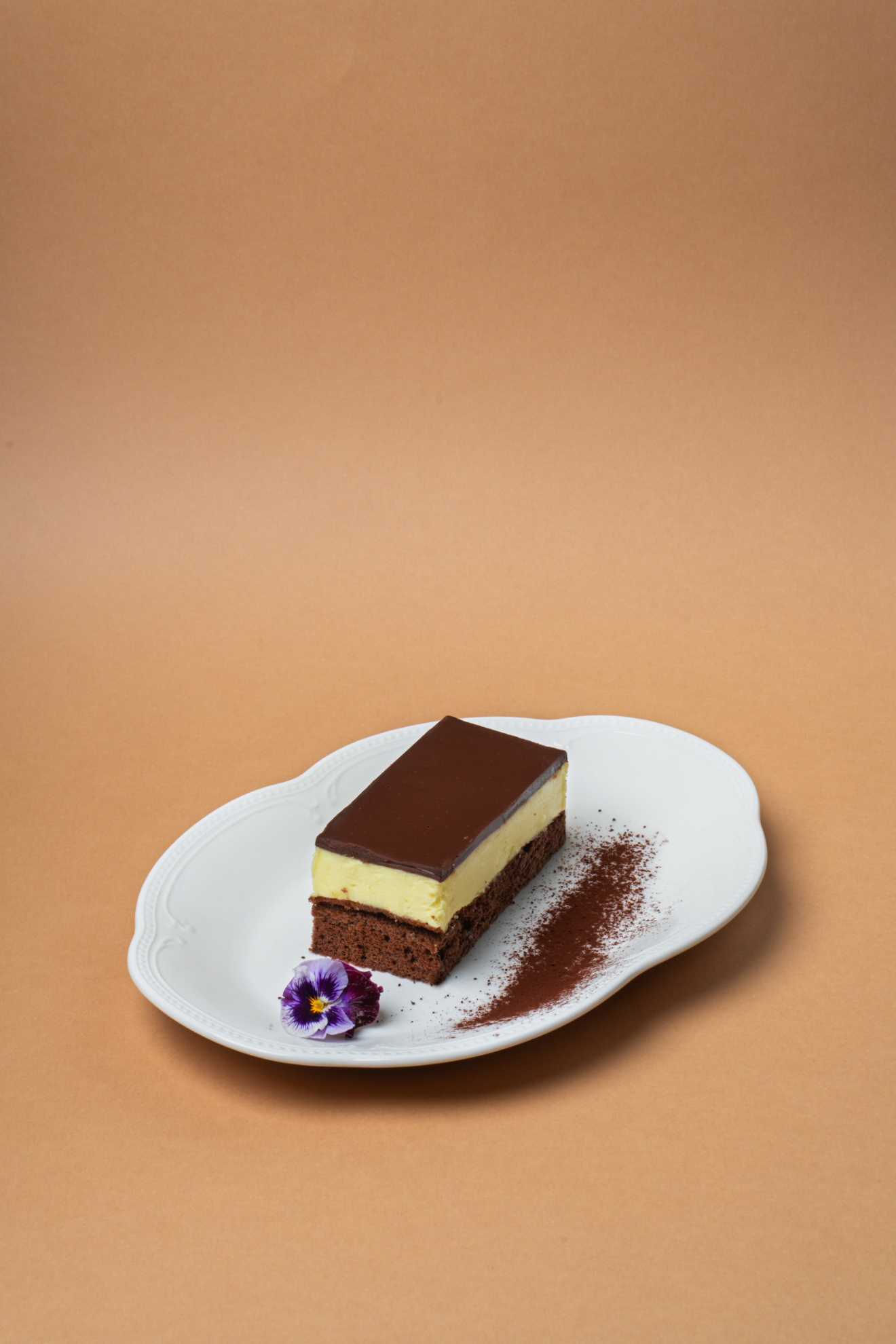 Ingredients: egg powder, warm pastry filled with chocolate, topped with fresh cream cheese frosting and chocolate sauce.