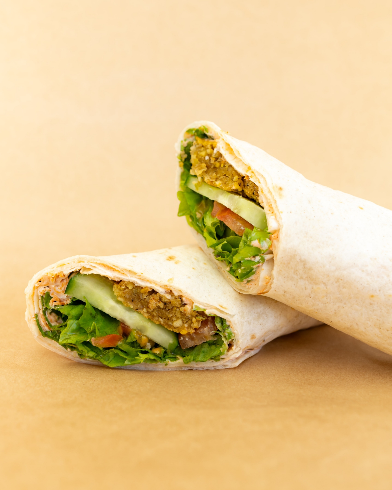 Falafel, pita bread, lettuce, cucumber, tomato, mutabal