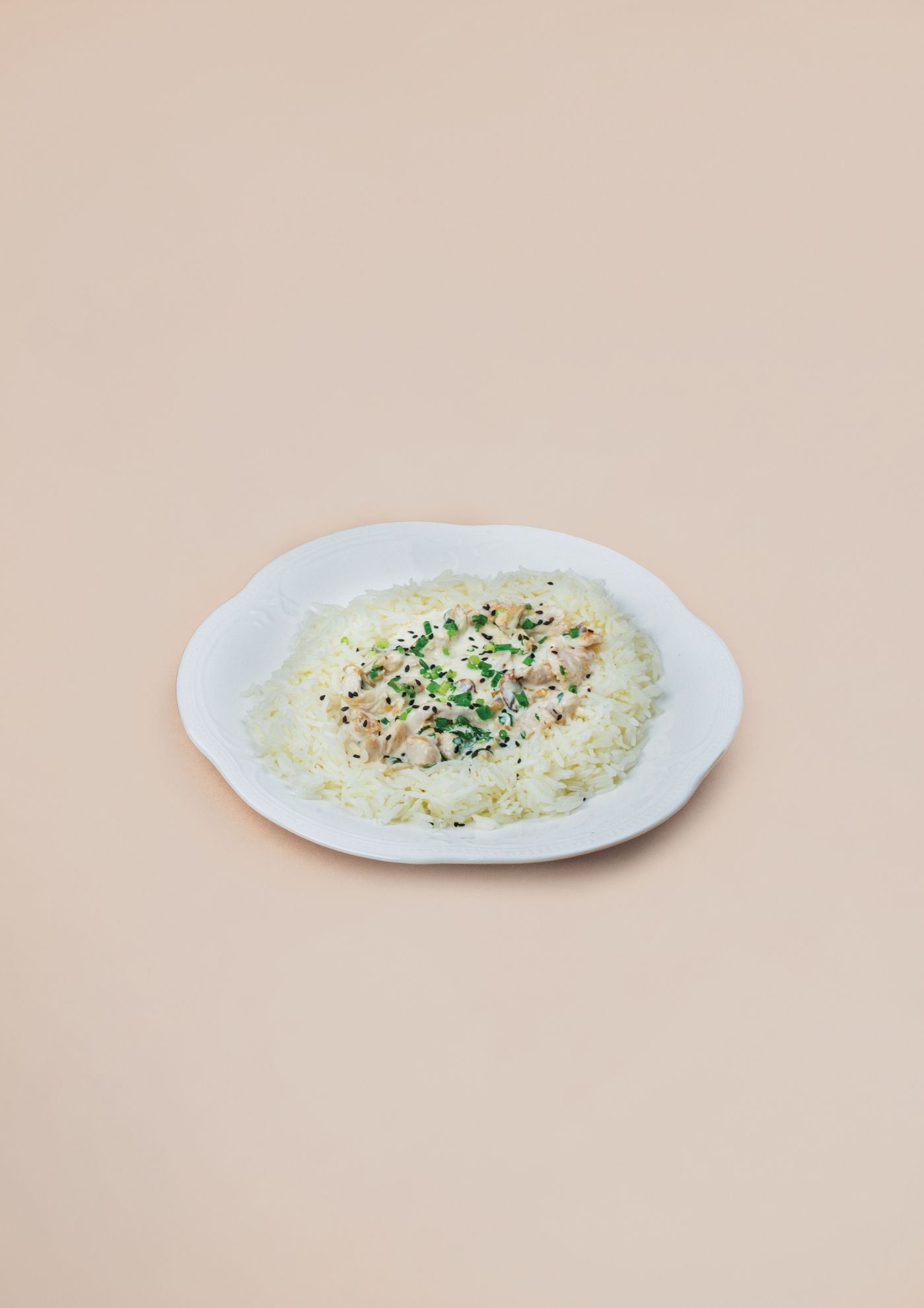 Chicken breast, onion green, cream, mushrooms, sesame seeds