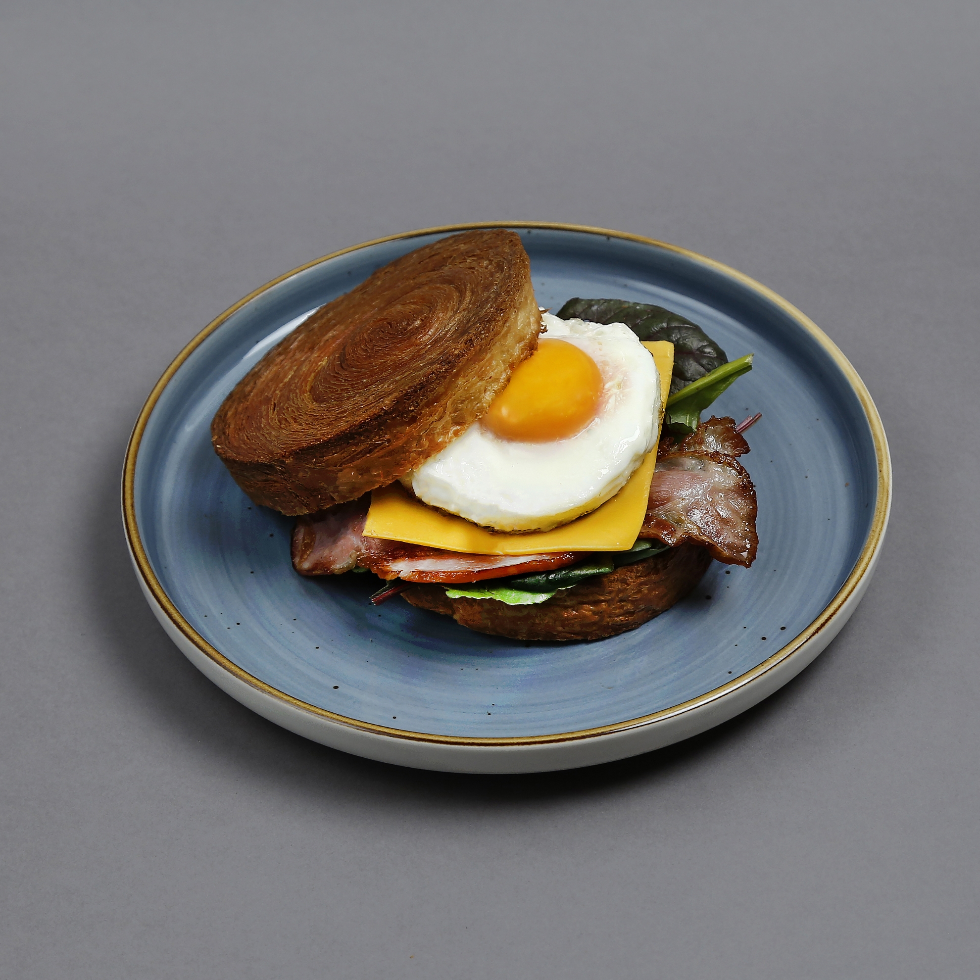 Croissant roll with cheddar cheese, bacon and fresh cherry tomatoes.