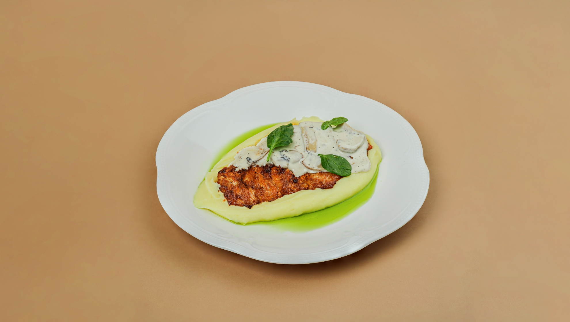 Grilled chicken breast, mashed potatoes, creamy mushroom sauce, parsley oil
