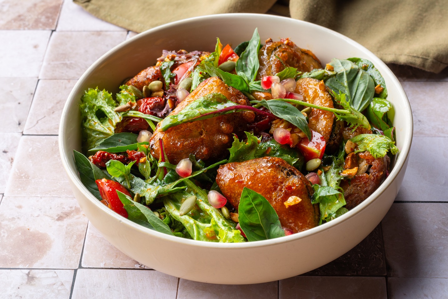 Mix salad, caramelized eggplant, dried tomatoes