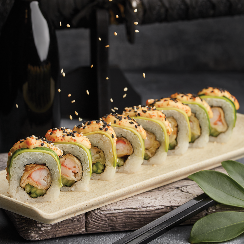 Tempura shrimp, tobiko caviar, avocado, cucumber, Japanese mayonnaise, sesame seeds.