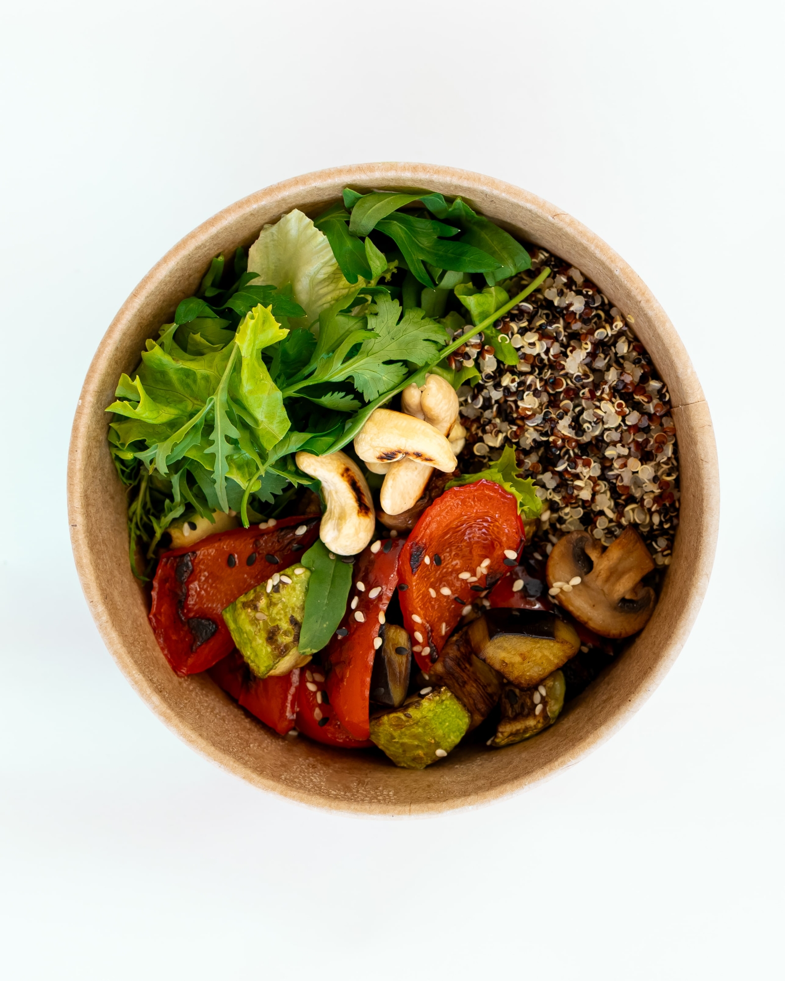 Grilled vegetables, quinoa, mixed greens, cashew nuts, mustard, lemon and honey sauce