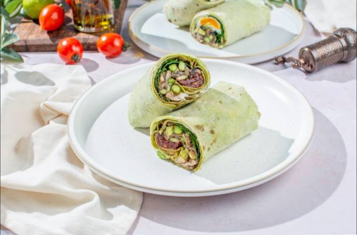 Tortilla, avocado, mushroom, edamame, spinach, parmesan, cream cheese, mozzarella, spices